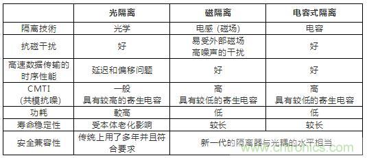 無(wú)論是光隔離、磁隔離或是電容式隔離,只要在適當(dāng)?shù)臈l件下工作都可以達(dá)到很出色的隔離效果。下圖是一個(gè)三種隔離技術(shù)的簡(jiǎn)單比較: