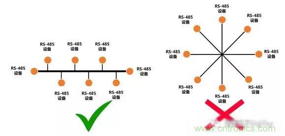 為了避免信號反射,在多個(gè)RS-485連接時(shí),支路長度(StubLength)越短越好。同時(shí)要避免其他類型的連接,比如星型連接。