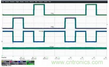 下圖3顯示的是關(guān)閉模板后示波器采集到的數(shù)據(jù)信號(hào),每個(gè)信號(hào)的波形形狀可以被清晰的顯示和觀察。示波器基于通道2的邊沿觸發(fā),所有4個(gè)波形同時(shí)被捕獲。