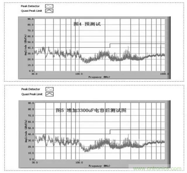 現(xiàn)場測試時,在模塊電源VH2處增加一個3300uf的電解電容,發(fā)現(xiàn)對輻射的抑制作用明顯,特別是在30MHz至1000MHz區(qū)間對毛刺和能量頻譜的抑制作用明顯(見圖4和圖5)。電容值越大,對毛刺尖峰的抑制作用越明顯,濾波后的曲線越平滑。當然,電容值的選擇需要按照實際的設(shè)計要求來定。