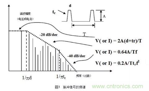 在EMC中,除了基本頻率外,還需考慮諧波因素,通常取十倍頻,但在數(shù)字電路中卻有些不同,比如在時鐘電路和邏輯門電路中,輻射帶寬與數(shù)字信號的上升沿或下降沿有關(guān)系,而不是數(shù)字信號的重復(fù)周期,其關(guān)系為:rtF?/1max?,其中rt是脈沖的上升沿時間。例如,典型時鐘驅(qū)動的邊沿速率是2ns,此時,maxF≈160MHz,再考慮十倍頻,則此時鐘電路可能產(chǎn)生直到1.6GHz的輻射帶寬。所以在選擇器件時要選擇慢速的邏輯器件系列,因為器件對電磁輻射貢獻(xiàn)的大小與工作頻率無直接關(guān)系而只取決于邊沿速率(這和從電路功能設(shè)計上選擇快速器件是矛盾的,在電路設(shè)計時需要折中考慮)。還有從器件的抗擾能力上來說,CMOS器件是最好的,因為它的噪聲容限高。從封裝上來說,BGA是最好的,因為它的引線很短。脈沖信號的頻譜如圖3所示。