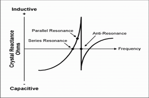 通過添加外部元件(通常是電容),石英晶體可振蕩在串聯(lián)與反諧振頻率之間的任何頻率上。在晶體工業(yè)中,這就是并聯(lián)頻率或者并聯(lián)模式。這個(gè)頻率高于串聯(lián)諧振頻率低于晶體真正的并聯(lián)諧振頻率(反諧振點(diǎn))。圖2給出了典型的晶體阻抗與頻率關(guān)系的特性圖。