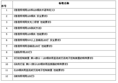 標準的目的在于加強生產(chǎn)的一致性、提升質量、并增進生產(chǎn)效率,若欲提升LED的制造質量,在全球化的競爭脫穎而出,標準是一項不可或缺的工具,因此加速對LED標準的制定是各國政府及業(yè)界非常重視的問題。2007年在半導體照明標準工作指導委員會的指導下,由“國家半導體照明工程研發(fā)及產(chǎn)業(yè)聯(lián)盟”成立“聯(lián)盟標準化協(xié)調推進工作組”,以負責協(xié)調中國的LED標準進度。而目前最新進展是由“全國照明電器標準化技術委員會”提出的普通照明用LED國家標準及行業(yè)標準等10多項標準目前都在送審階段,預計于今年陸續(xù)頒布實施,如表所示。