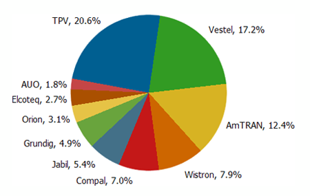 從代工廠商排名來(lái)看,TPV主要客戶(hù)有Vizio、AOC以及Philips,第一季市占率為20.6%排名居首;Vestel以17.2%市占率居次,而其主要生產(chǎn)供貨給自有品牌、白牌業(yè)者以及賣(mài)場(chǎng)品牌機(jī)種;第三名代工廠商為AmTRAN,第一季市占率12.4%,該公司主要客戶(hù)為Vizio。同時(shí)隨著中國(guó)液晶電視出貨對(duì)全球液晶電視市場(chǎng)日益重要,以及國(guó)內(nèi)品牌廠商市占率超過(guò)海外品牌廠商,DisplaySearch在每季度報(bào)告中均包括有中國(guó)電視廠商供應(yīng)鏈的詳細(xì)分析,對(duì)關(guān)心中國(guó)市場(chǎng)的客戶(hù)是一份相當(dāng)值得參考的資料。