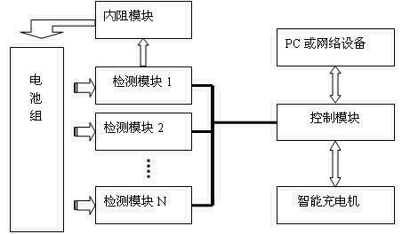 如圖3-1所示,裝置由控制模塊、檢測模塊、內(nèi)阻模塊、相關(guān)軟件和輔助部件構(gòu)成,一個控制模塊可接入多個檢測模塊,完成對不同只數(shù)和不同電壓規(guī)格的蓄電池組的監(jiān)測管理,可同時管理多組蓄電池。