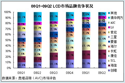 T6陣營(TCL、創(chuàng)維、海爾、海信、長虹、康佳)在2008年,借助“奧運(yùn)攻勢”等活動(dòng)發(fā)力,并通過產(chǎn)品線的不斷更新定義,終端渠道的投入及價(jià)格戰(zhàn)等逐步確立主導(dǎo)地位。但由于受面板價(jià)格上升及缺貨的影響,2009年二季度國內(nèi)品牌市場地位容易下滑,S3(三星、索尼、夏普)挾技術(shù)及面板資源攻守兼?zhèn)?,同時(shí)LG、冠捷、清華同方品牌也正發(fā)力提升LCD電視市場銷售,市場競爭愈加激烈。