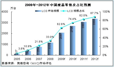 受上半年經(jīng)濟(jì)形勢低迷以及產(chǎn)品替代影響,即使在家電下鄉(xiāng)、節(jié)能補(bǔ)貼、以舊換新三大政策刺激下,2009年全年彩電市場零售量規(guī)模將較2008年下降6.5%。但對(duì)于液晶電視來說,則得益于三大政策的刺激,繼續(xù)保持高速增長,預(yù)計(jì)全年LCD電視市場國內(nèi)零售量規(guī)模近2100萬臺(tái),出貨規(guī)??蛇_(dá)2400萬臺(tái),LCD電視市場將占總體市場比達(dá)到62.6%。