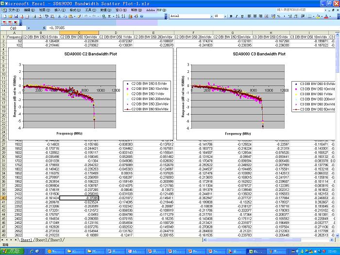 此外,在計(jì)量波特圖時(shí)需要對(duì)示波器每個(gè)檔位都進(jìn)行計(jì)量,最終產(chǎn)生的波特圖是所有檔位的結(jié)果疊加在一起的。波特圖的計(jì)量是需要半天時(shí)間完成的,并不是想象中那么輕松的工作。如圖8所示是力科SDA9000的波特圖,我特地將Excel中大量數(shù)據(jù)顯示給大家以使大家對(duì)校準(zhǔn)的嚴(yán)謹(jǐn)性有深刻認(rèn)識(shí)。 其垂直軸是-1dB/div, 疊加了10mv/div、20mv/div、50mv/div、200mv/div、500mv/div、1v/div等檔位的測(cè)試結(jié)果。 很多時(shí)候,我們的競(jìng)爭(zhēng)對(duì)手會(huì)把他們的波特圖畫成-10dB/div、只有一個(gè)檔位的測(cè)試結(jié)果拿給客戶,并和力科提供的這種-1dB/div、各種檔位疊在一起顯示的結(jié)果放在一起進(jìn)行對(duì)比,然后他們告訴客戶,他們的波特圖更平坦,更干凈,甚至將力科波特圖上面密密麻麻的點(diǎn)說成是“噪音”大。這是有點(diǎn)貽笑天下的。 競(jìng)爭(zhēng)對(duì)手敢于一再采用這種做法,這是假設(shè)中國(guó)的工程師都沒有辨別力,獨(dú)立思考能力,是對(duì)工程師嚴(yán)重不尊重的公然欺騙行為。希望能引起大家注意。