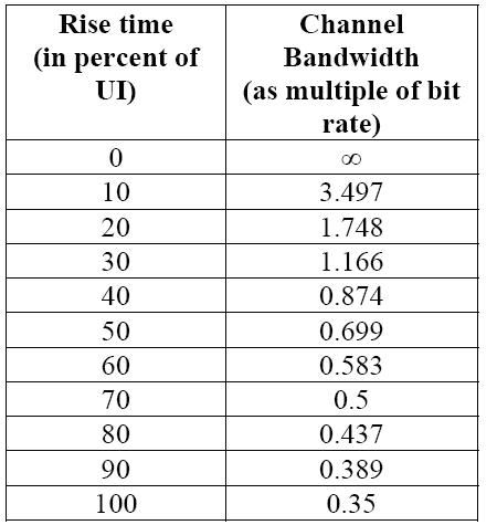 3, 對(duì)串行數(shù)據(jù)信號(hào)而言,數(shù)據(jù)比特率和上升時(shí)間是最重要的兩個(gè)因素。有一個(gè)非常好的評(píng)估準(zhǔn)則是:示波器的帶寬 > 1.8 X 信號(hào)比特率. 在這個(gè)準(zhǔn)則下,如果被測(cè)信號(hào)的上升時(shí)間>20%UI,那么1.8關(guān)系的帶寬能捕獲信號(hào)能量的99%. 下面的圖表給出了不同的上升時(shí)間和帶寬之間的關(guān)系。