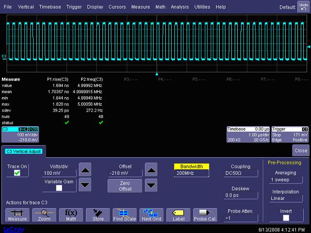 圖14,帶寬限制到200MHz時(shí)測(cè)量5MHz時(shí)鐘上升時(shí)間