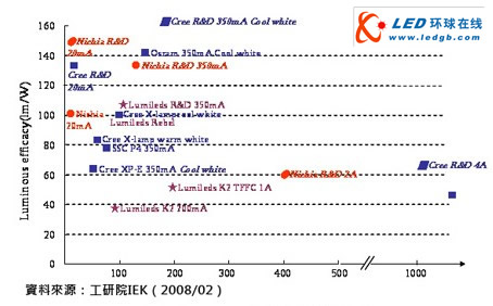 2001年標(biāo)準型白光LED(20mA)發(fā)光效率僅25lm/W,至2009年初Nichia發(fā)表之白光LED,在20mA電流下,其發(fā)光效率可達249lm/W,為目前業(yè)界之最。高功率白光LED(350mA)發(fā)光效率也由2004年約30 lm/W,截至2008年年底Cree發(fā)表161lm/W產(chǎn)品為業(yè)界之最。