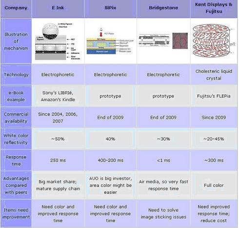 - 開發(fā)廠商正逐漸針對畫素反應速度、彩色化、可卷曲式基板、觸控面板整合等等不斷有新的進展
