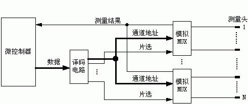 由圖2可見,若以VA作為測量的電壓量,理論上當(dāng)VA=0時應(yīng)為通路,VA>0時應(yīng)為斷路,且VA的值隨兩測量通道之間的電阻值的不同而變化。但由于模擬多路開關(guān)本身有不可忽略的導(dǎo)通電阻RON,這樣,在測量通路形成后,若為通路,VA并不等于0,而是等于RON上的電壓降。由于測量的目的只是獲知通/斷路關(guān)系,沒有必要去測量VA的具體值,為此只需用電壓比較器比較VA是否大于RON上的電壓降即可。設(shè)置電壓比較器的閾值電壓等于RON上的電壓降,電壓比較器的輸出就是測量結(jié)果,該結(jié)果為可直接由微控制器讀取的數(shù)字量。