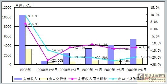 2009年3月重點企業(yè)主營收入累計實現(xiàn)2388.0億元,在國外市場需求低迷不振,出口交貨持續(xù)走低的情況下大幅回升,相對2月,主營收入同比降幅回升了近9個百分點,二季度則進(jìn)入平穩(wěn)調(diào)整。重點企業(yè)出口交貨2009年初持續(xù)下滑,5月份開始出現(xiàn)觸底回升跡象,但出口形勢依舊不容樂觀。預(yù)計振興規(guī)劃各項措施的不斷落實,將為電子信息產(chǎn)業(yè)發(fā)展帶來增長動力。
