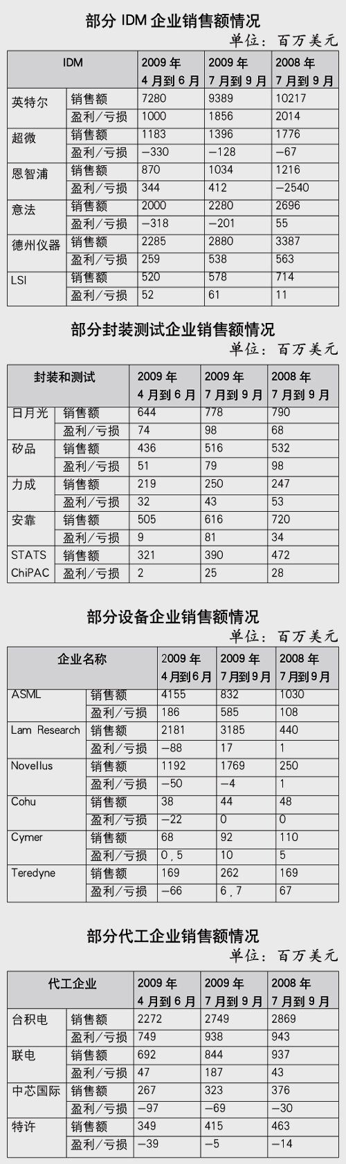 國際金融危機(jī)重創(chuàng)半導(dǎo)體業(yè)。今年第一季度企業(yè)產(chǎn)能利用率普遍在50%以下。進(jìn)入第二季度后,我們看到部分企業(yè)業(yè)務(wù)止跌回升。近日,企業(yè)第三季度財(cái)報(bào)紛紛出籠,產(chǎn)業(yè)好轉(zhuǎn)趨勢(shì)進(jìn)一步明朗化。但由于企業(yè)上升動(dòng)力不足,產(chǎn)業(yè)出現(xiàn)“V型”反彈的可能性不大,應(yīng)該會(huì)在振蕩中上升。與此同時(shí),今年半導(dǎo)體業(yè)銷售額同比下降約15%的狀況已確定無疑。業(yè)內(nèi)目前關(guān)注明年產(chǎn)業(yè)上升的幅度。