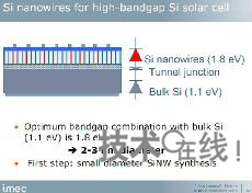 IMEC的目標(biāo)是實(shí)現(xiàn)在硅底板上形成硅納米線的太陽能電池。硅底板的帶隙為1.1eV,而利用量子效應(yīng)的硅納米線為1.7~1.8eV。組合帶隙不同的硅底板和硅納米線,可期待提高效率。Poortmans表示:“如果這一設(shè)想能夠?qū)崿F(xiàn),轉(zhuǎn)換效率將達(dá)到約33%”。