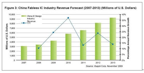 在金融危機影響下全球半導體業(yè)最新的預測是下降12%。在中國獨特的環(huán)境下按iSuppli的預測,2009年中國半導體市場下降6.8%及其設計業(yè)將增長24.2%,達到42億美元。這個數(shù)字占全球fabless約 500億美元的8%,及占中國半導體業(yè)銷售額,09年約1118億元的25.6%,可謂是取得不差的成績。