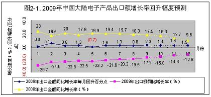 2008年下半年,國際金融風(fēng)暴席卷全球,以出口為主導(dǎo)的中國大陸電子信息產(chǎn)業(yè)直接受到?jīng)_擊,產(chǎn)品進(jìn)出口受阻,導(dǎo)致產(chǎn)品產(chǎn)量不斷下降,到今年元月份下降到谷底。由于中國政府及時實行積極的財政政策,調(diào)整產(chǎn)品結(jié)構(gòu),努力擴(kuò)大內(nèi)需,電子信息產(chǎn)業(yè)從2月份開始逐漸回升。雖然在個別月份有所波動,但回升趨勢穩(wěn)定向好。預(yù)計2009年全行業(yè)能實現(xiàn)5%左右的增長;進(jìn)出口額雖然有較大幅度的回升,但仍將呈現(xiàn)負(fù)增長;由于政府積極擴(kuò)大內(nèi)需,國內(nèi)市場將繼續(xù)保持10%左右的較快增長。