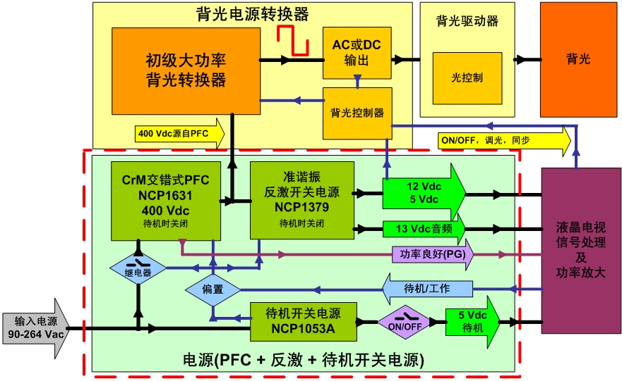 液晶電視電源包含功率因數(shù)校正(PFC)、信號電源、背光電源及ECO待機(jī)等多個組成部分,不同部分往往包含不同的架構(gòu)可供選擇,參見圖1。以PFC段為例,可以選擇如臨界導(dǎo)電模式(CrM)、連續(xù)導(dǎo)電模式(CCM)或交錯式頻率鉗位臨界導(dǎo)電模式(FCCrM)等不同的PFC控制器。選擇何種電源架構(gòu),需結(jié)合應(yīng)用的屏幕尺寸、功率等級及背光源等因素。另外,作為重要賣點(diǎn)的纖薄設(shè)計也影響著電源方案的選擇。