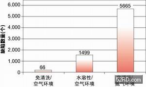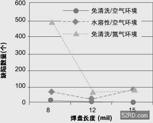 圖1顯示出三種不同組裝工藝的良品率情況。由圖可見,使用免清洗焊膏在空氣環(huán)境下進行回流焊產(chǎn)生的不良最少,總數(shù)為66個;使用水溶性焊膏在空氣環(huán)境下進行回流焊次之,不良有1,499個;使用免清洗型焊膏在充氮環(huán)境下進行回流焊產(chǎn)生的不良數(shù)最多,為5,665個。圖3還表明在充氮環(huán)境下以及焊膏助焊成分活性增大(水溶性焊膏)時,產(chǎn)生的不良數(shù)目會增多。