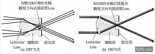 (圖四)(a)是傳統(tǒng)CRT背投電視螢?zāi)坏膭?dòng)作特性圖,由圖可知RGB各影像光線分別從相異方向投射到螢?zāi)?,?dāng)影像光線從螢?zāi)怀錾鋾r(shí)必需進(jìn)行光線整合,因此觀視方向的螢?zāi)槐砻嫱ǔ?huì)設(shè)置LenticularLens;圖四(b)是MD方式背投電視螢?zāi)坏膭?dòng)作特性圖,由圖可知它使用MD方式投影機(jī)投射影像,所以觀視方向的螢?zāi)槐砻娌恍柙O(shè)置LenticularLens。