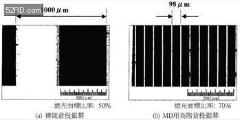 如上所述RP-TV用螢?zāi)煌ǔJ窃诿髁潦覂?nèi)環(huán)境中使用,對(duì)RP-TV螢?zāi)欢宰钄嗍覂?nèi)外亂光提高影像對(duì)比(Contrast)非常重要。影像光線穿透時(shí)不會(huì)被遮光部遮蔽的前提下,通常開口部的面積越小,亦即遮光部的面積比率越大,遮蔽外亂光的能力越強(qiáng),影像對(duì)比也越高。