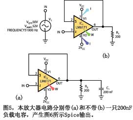 如果你能確定IC通過信號的特性,就可以用Spice來估算功耗。此時必須保證使用恰當?shù)腟pice模型,它們對一些測試信號給出合理的結(jié)果,而功耗計算此時沒有價值。圖5表示一個Spice圖。芯片的功耗不同于到達負載的功率。圖6是圖5示意圖的Spice曲線圖。它以紅線表示啟動的振蕩。電路是否會發(fā)生這種振蕩只是個人的猜測,但它應(yīng)該會使你在建立原型后查看這種行為。記住,在OrcadCapture上點擊W鍵只能顯示芯片的靜態(tài)功耗。要獲得工作時的功耗,要用示意圖上的功率標記,然后用曲線程序的rms-math函數(shù),給出器件的平均功耗。