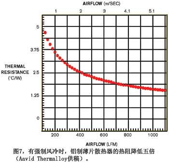 對流散熱也有一些困難。例如,氣流對商用散熱片的影響(圖7)。注意,在高溫下,熱阻會增加五倍。使用強制風冷的散熱片有較薄、間距更近的鰭片,比如一款風扇式CPU冷卻器。如果你的產(chǎn)品沒有風扇,則IC產(chǎn)生的熱量會傳導(dǎo)和散播出來,然后傳送到機內(nèi)的空氣中。接下來,隨著整個機器溫度的上升,熱量通過對流傳送給周圍的空氣,如果你把機器放在腿上,則部分熱量也會傳導(dǎo)過來。外殼材料的熱阻就變得很重要。熱量從內(nèi)向外的傳送速度,塑料殼要慢于金屬殼。