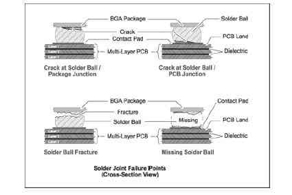 隨著時(shí)間的推移,焊接部位會(huì)因?yàn)槔鄯e應(yīng)力的損傷而產(chǎn)生裂縫。裂縫常見于器件與PCB焊接的邊緣。裂縫會(huì)造成焊接球與BGA封裝器件或PCB板的部分分開。一種典型的裂縫位置在BGA封裝和焊接球之間,另一種典型的裂縫在PCB和焊接球之間.對(duì)已有裂縫的焊接球的繼續(xù)損傷就會(huì)導(dǎo)致另一種類型的失效-焊接球斷裂。