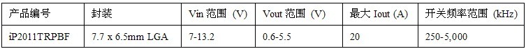 iP2010的輸入電壓范圍為7V至13.2V,輸出電壓范圍則為0.6V至5.5V,輸出電流高達(dá)30A。這個(gè)器件最高運(yùn)行頻率為3MHz。在5MHz運(yùn)行時(shí),與iP2010引腳兼容的iP2011備有相同的輸入和輸出電壓范圍,但后者經(jīng)過優(yōu)化,從而使最高輸出電流高達(dá)20A。通過以通用占位面積提供多種電流額定值器件,IR提供的靈活性能夠滿足不同客戶對(duì)電流水平、性能和成本的要求。