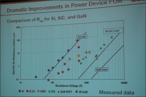 這個(gè)采用氮化鉀材料的新器件可以將系統(tǒng)的效率改善3.5%到7%,采用簡單的熱控制即可達(dá)到節(jié)能效果,在目前綠色節(jié)能的大趨勢(shì)下可以發(fā)揮重要作用。在改善功率器件的優(yōu)值系數(shù)方面,這個(gè)氮化鎵 (GaN) 功率器件也表現(xiàn)突出,如下圖所示。