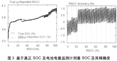 即使在負載變化的情況下,IT電量監(jiān)測計也能正確預(yù)測電池的剩余電量。例如,數(shù)碼相機處于不同工作模式時,電池的負載也不同。圖3顯示了IT電量監(jiān)測計如何精確預(yù)測電池剩余電量。剩余電量預(yù)測的誤差率可小于1%。并且,由于用以預(yù)測剩余電量的電池阻抗及老化作用能夠得到實時更新,故在電池整個使用壽命內(nèi)均可保持這種微小誤差。