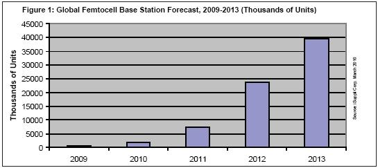 圖1所示為iSuppli公司對于2009-2013年femtocell基站出貨情況的預測。