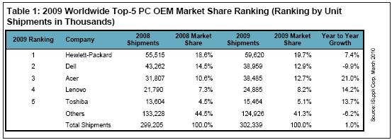 從2009年全年來看,五大PC OEM廠商中有四家增長率高于整體產(chǎn)業(yè)。最大廠商惠普增長7.4%。宏基、聯(lián)想和東芝分別排是第三、第四和第五大廠商,分別增長21%、14.2%和13.7%。排名第二的戴爾出貨量下降。