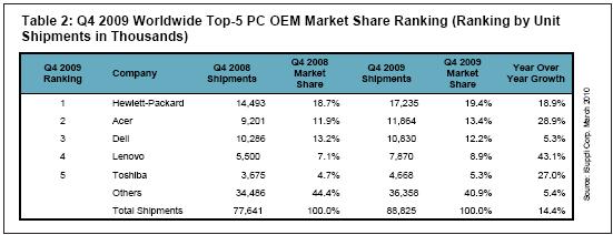 2009年第四季度,五大PC廠商的排名與第三季度相同。