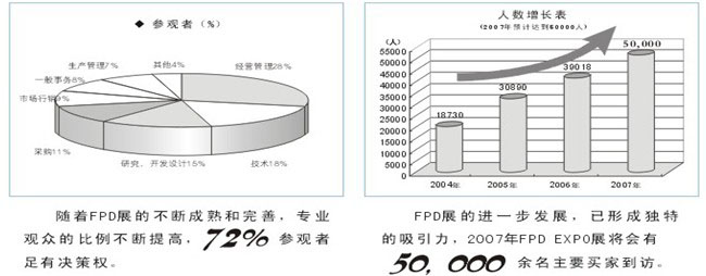 ●“光電平板顯示展”將吸引知名FPD企業(yè)的高管(日立、夏普、三星、LG、友達、華映等)、通路商的高管、政府要員、技術人員等近五萬人到場,同時組委會將通過國內(nèi)外相關行業(yè)協(xié)會、商會組織專業(yè)士參觀。