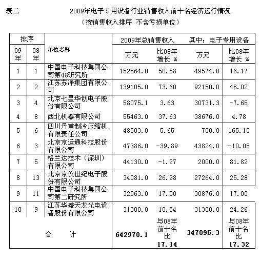 2009年電子專用設備行業(yè)前十名銷售收入總額達到64.3億元,占全行業(yè)銷售收入的69.9(2006年為61% 2007年為63.9% 2008年為66.5%),比2008年的前十名銷售收入增長17.14%。入圍前十名的銷售收入也從2008年的2.82億元提高到2009年的3.13億元。中國電子科技集團公司第四十八研究所,2009年在太陽能設備和太陽能電池片的推動下得到了快速的發(fā)展,總銷售收入達到15.3億元,繼續(xù)位居行業(yè)的首位。