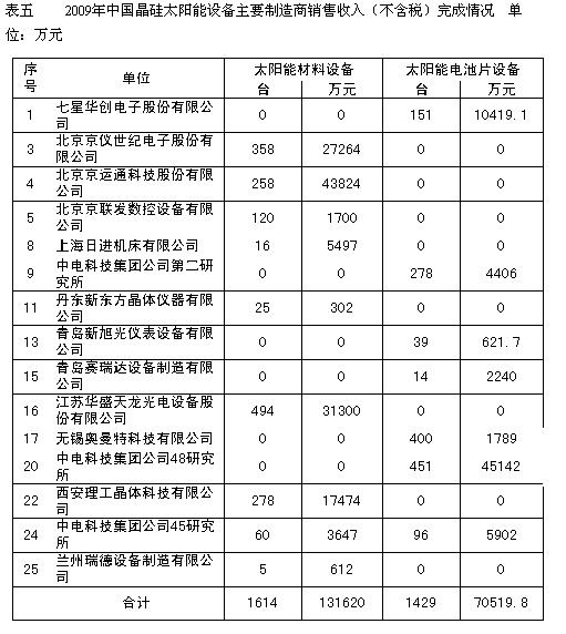 2009年下半年在光伏產(chǎn)業(yè)市場的推動下,我國晶硅太陽能設備得到迅速復蘇,2009年我國主要太陽能電池制造商太陽能設備銷售收入比2008年增長了14.44%,達到20.21億元。其中:太陽能級晶硅生長和加工設備增長7.34%,達到13.16億元,占太陽能電池設備銷售收入的65.1﹪(2008年為69.4%);晶硅太陽能電池芯片制造設備增長30.56%,達到7.05億元,占太陽能電池設備銷售收入的34.9﹪。