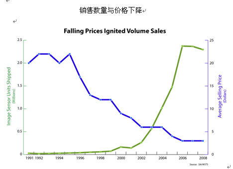 半導體在新應用中增加滲透最有趣的例子是隨著市場應用的銷售額增加,而芯片的價格卻不斷下降。如數(shù)碼相機,其中使用的半導體主要是非揮發(fā)存儲器,圖像傳感器 。在1990年代初期,固態(tài)圖像傳感器的售價為20-25美元,直到最近10年,圖像傳感器的總市場銷售額,仍是很小,幾乎可忽略不計。在2000年代圖像傳感器的價格己從20-25美元下降到5美元。在這價格范圍時,由于使用數(shù)量急速上升,使得在過去幾年中圖像傳感器的TAM達到半導體總銷售額的3%以上。在此同時,NAND閃存價格每年下降65%, 主要是市場需求數(shù)量成正比增加。其結果是數(shù)碼相機的銷售額及其使用的半導體持續(xù)的增長。