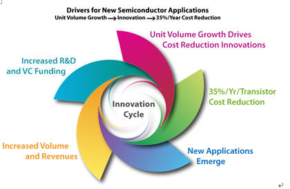 在新的應用和市場增長推動下,此種模式在半導體業(yè)中一次又一次的重復, 即應用數(shù)量的增長推動了半導體芯片價格的下降。應用市場的擴大又推動銷售額增大,進而為發(fā)展新技術提供資金, 進一步促進成本的下降, 又能增加新的應用市場誕生。如在數(shù)碼相機情況下, 低成本的固態(tài)圖像傳感器及存儲介質推動其銷售量的上升, 同樣能在數(shù)字攝像, 安全系統(tǒng), 醫(yī)療中圖像處理, 汽車中及其它許多場合中得到大量的應用。因此, 半導體TAM的增長不僅是因為晶體管的價格每年下降35%, 而是由于許多新的應用市場的推廣共同促成。