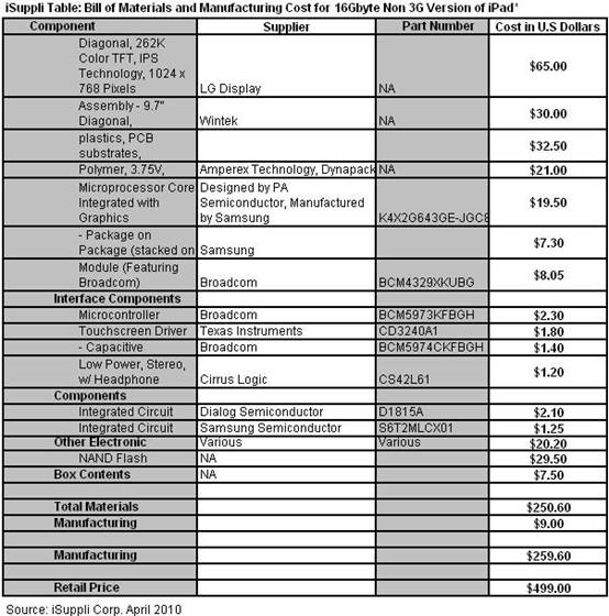 根據(jù)對16GB非3G版iPad的物理拆機分析,iSuppli公司估計低端16GB非3G版iPad的材料成本(BOM)為250.60美元。如果計入生產(chǎn)費用,成本是259.60美元。