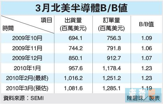 國(guó)際半導(dǎo)體設(shè)備材料產(chǎn)業(yè)協(xié)會(huì)(SEMI)公布,3月最新北美半導(dǎo)體訂單出貨比(Book-to-Bill)為1.19,較2月修正后的1.23略為下降,仍是連續(xù)第九個(gè)月超過(guò)1以上的紀(jì)錄,加上絕對(duì)訂單,與出貨金額各創(chuàng)30個(gè)月與20個(gè)月新高,顯示半導(dǎo)體景氣仍在多頭。
