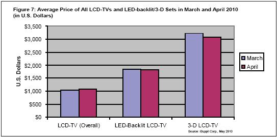 圖7所示為2010年3月和4月整體液晶電視與LED及3D電視平均價格的對比。