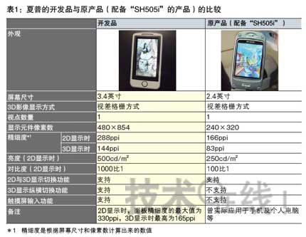 此次為了實現(xiàn)量產(chǎn),夏普進行了以下改進:①提高了顯示性能;②實現(xiàn)了薄型化。①顯示性能方面,分別將影像顯示用液晶面板的精細度和亮度提高到了原來的兩倍(表1)。因此,即使進行3D顯示,最大精細度也可達到165ppi。據(jù)介紹,這是通過驅(qū)動元件(TFT)的微細化實現(xiàn)的。該公司稱,還通過提高兩張面板的粘合精度,減輕了左眼用和右眼用影像重疊的“串擾(Crosstalk)”現(xiàn)象。