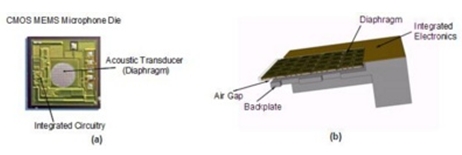 在CMOSMEMS平臺上開發(fā)的單塊集成電路硅晶麥克風(fēng)解決方案使消費(fèi)電子設(shè)備設(shè)計(jì)人員和制造商得以避免眾多ECM相關(guān)問題。下圖是一個(gè)單芯片硅晶麥克風(fēng)的俯視圖和橫截面圖。這一單塊芯片由MEM換能器(transducer)和阻抗匹配線路組成,它也是一個(gè)帶有可移動振膜和剛性背板的電容性傳感器。