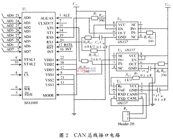 選用芯片82C250作為CAN控制器和物理總線間的驅(qū)動(dòng)接口,可以提供對(duì)總線的差動(dòng)發(fā)送能力和對(duì)CAN控制器的差動(dòng)接收能力,其最高速可達(dá)1Mb/s。由于實(shí)際系統(tǒng)中存在干擾,故增加高速光隔6N137,以起到隔離的作用。電氣接口很簡(jiǎn)單,有CANH和CANL兩根線,用以完成CAN的數(shù)據(jù)傳輸。在CAN總線的兩端有一個(gè)120Ω的電阻,其作用為匹配總線阻抗,用于提高數(shù)據(jù)通信的抗干擾性及可靠性。具體電路如圖2所示。