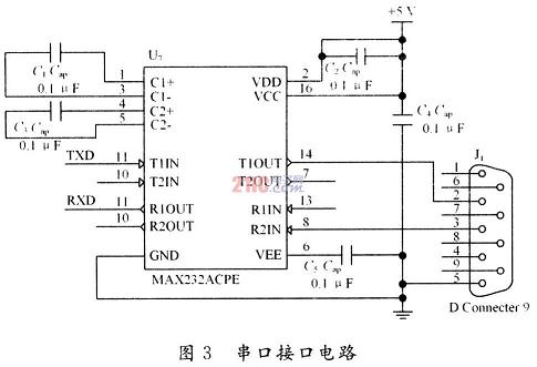 RS232標(biāo)準(zhǔn)是美國(guó)電子工業(yè)聯(lián)合會(huì)(EIA)制定的一種串行物理接口標(biāo)準(zhǔn),它適合于數(shù)據(jù)傳輸率在O~20000b/s范圍內(nèi)的通信,目前廣泛用于計(jì)算機(jī)與終端或外設(shè)之間的近端連接。實(shí)際工作時(shí),應(yīng)保證電平在5~15V之間。所以為了與單片機(jī)進(jìn)行通信。必須對(duì)其電平進(jìn)行轉(zhuǎn)換?,F(xiàn)在常用的轉(zhuǎn)換芯片是MAX232。MAX232內(nèi)部有電壓倍增電路和轉(zhuǎn)換電路,只需5V電源便可實(shí)現(xiàn)TTL電平與RS232電平的轉(zhuǎn)換,使用十分方便。串口接口電路如圖3所示。