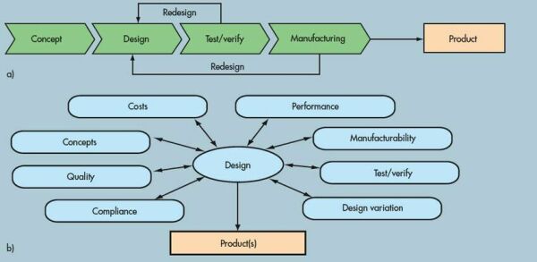 圖:(a)傳統(tǒng)PCB串行開發(fā)流程的設(shè)計(jì)周期長(zhǎng),信息共享有限,而成本持續(xù)上升;(b)并行開發(fā)流程允許多個(gè)開發(fā)程同步進(jìn)行,有助于確保設(shè)計(jì)成功,避免延誤、額外開銷以及返工。