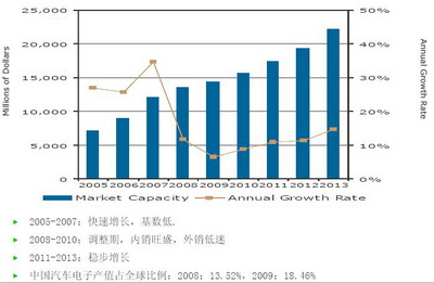 去年汽車電子一枝獨(dú)秀,增長了13.2%。汽車電子目前看來經(jīng)歷了三個時期:2005年—2007年處于快速成長期,年增長率超過30%,2008年—2010年處于調(diào)整期,2010年—2013年將會是穩(wěn)步增長期。中國汽車電子產(chǎn)值占全球比例上升速度比較快,2008占13.52%,而2009已經(jīng)占到18.46%。