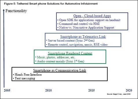 從信息娛樂(lè)角度來(lái)看,iSuppli公司認(rèn)為將轉(zhuǎn)向分層式軟件架構(gòu),設(shè)備在整體產(chǎn)品壽命期內(nèi)不被鎖定。通過(guò)Genivi、Android或Windows Embedded Automotive實(shí)現(xiàn)的本地應(yīng)用支持,提供支持這種功能的靈活性。iSuppli公司還認(rèn)為,Terminal模式將在市場(chǎng)上火起來(lái),盡管面臨挑戰(zhàn)。在中間,有一類通過(guò)定制軟件接口運(yùn)行的非本地應(yīng)用,如福特的Sync,或者家中眾多其它的連網(wǎng)設(shè)備。